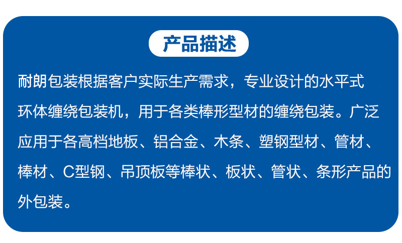 根据客户实际生产需求,专业设计的水平式 环体缠绕包装机,用于各类棒形型材的缠绕包装。广泛 应用于各高档地板、铝合金、木条、塑钢型材、管材、 棒材、C型钢、吊顶板等棒状、板状、管状、条形产品的 外包装。