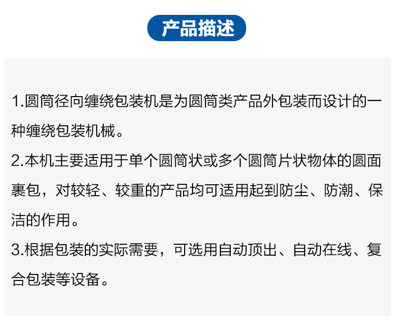 圆筒缠绕机,主要对于产品圆柱物体且较轻或需要压缩产品而设计,圆筒径向缠绕包装机是为圆筒类产品外包装而设计的一种缠绕包装机械。本机主要适用于单个圆筒状或多个圆筒片状物体的圆面裹包,对较轻、较重的产品均可适用起到防尘、防潮、保洁的作用。根据包装的实际需要,可选用自动顶出、自动在线、复合包装等设备。