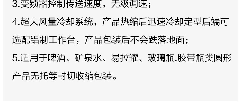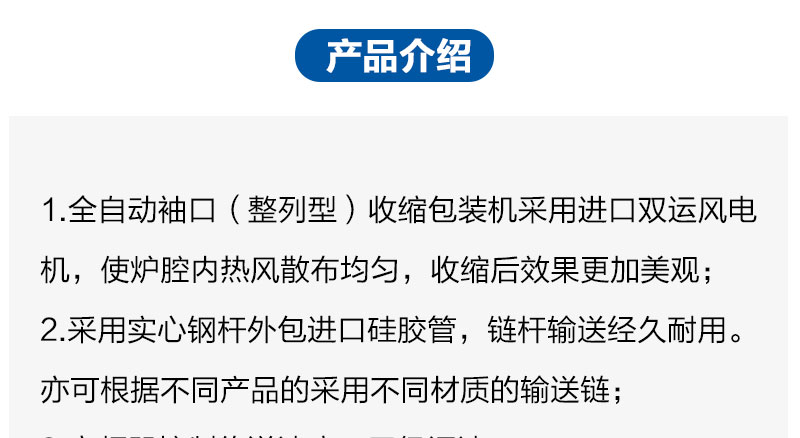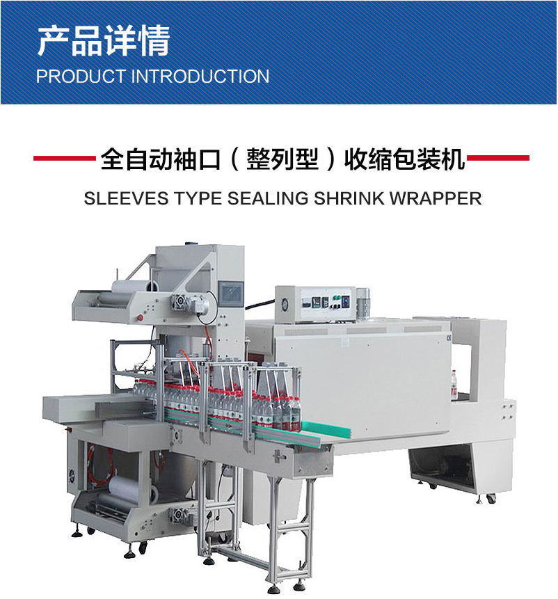 全自动袖口(整列型)收缩包装机采用进口双运风电机,使炉腔内热风散布均匀,收缩后效果更加美观采用实心钢杆外包进口硅胶管,链杆输送经久耐用。亦可根据不同产品的采用不同材质的输送链;变频器控制传送速度,无级调速超大风量冷却系统,产品热缩后迅速冷却定型后端可选配铝制工作台,产品包装后不会跌落地面适用于啤酒、矿泉水、易拉罐、玻璃瓶.胶带瓶类圆形产品无托等封切收缩包装。