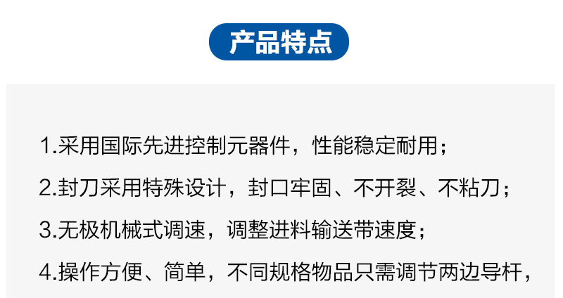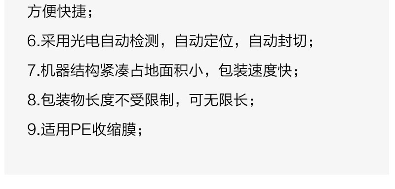 该系列产品广泛应用于食品、饮料、糖果、文化用品、五金工具、日用百货、化工用品等行业的自动化封切、收缩包装,可连生产线进行无人化操作,也可单机使用,经济实用采用国际先进控制元器件,性能稳定耐用;封刀采用特殊设计,封口牢固、不开裂、不粘刀;自动进料、送膜、封切;无极机械式调速,调整进料输送带速度;操作方便、简单,不同规格物品只需调节两边导杆,方便快捷;采用光电自动检测,自动定位,自动封切;机器结构紧凑占地面积小,包装速度快;包装物长度不受限制,可无限长;适用PE收缩膜。