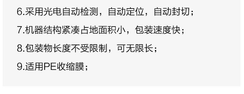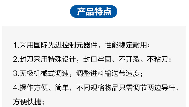 采用国际先进控制元器件,性能稳定耐用;封刀采用特殊设计,封口牢固、不开裂、不粘刀;自动进料、送膜、封切;无极机械式调速,调整进料输送带速度;操作方便、简单,不同规格物品只需调节两边导杆,方便快捷;采用光电自动检测,自动定位,自动封切;机器结构紧凑占地面积小,包装速度快;包装物长度不受限制,可无限长;适用PE收缩膜。