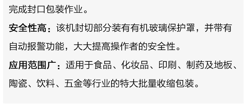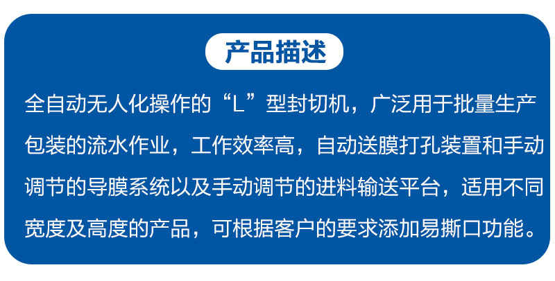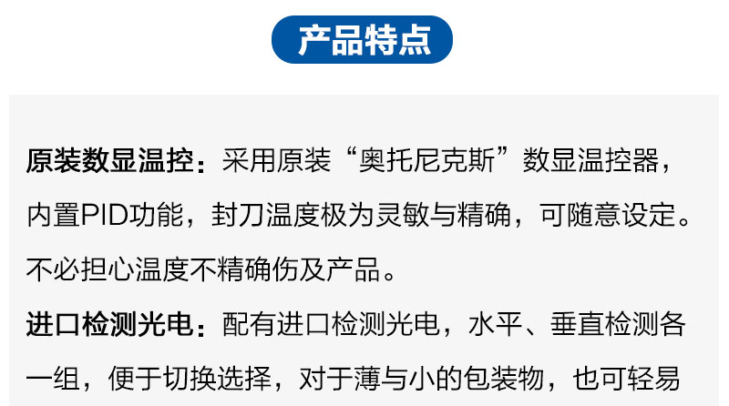 全自动无人化操作的“L”型封切机,广泛用于批量生产包装的流水作业,工作效率高,适用不同宽度及高度的产品,封刀采用杜邦特弗龙涂层抗粘耐高温铝合金刀,封口不开裂,不焦化、不冒烟零污染。配有进口检测光电,对于薄与小的包装物,也可轻易完成封口包装作业。采用原装“奥托尼克斯”数显温控器,内置PID功能,封刀温度极为灵敏与精确,自身还带有自动保护功能,有效防止误切包装。该机封切部分装有有机玻璃保护罩,并带有自动报警功能,大大提高操作者的安全性。