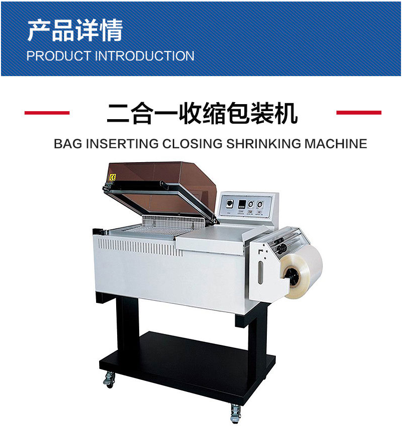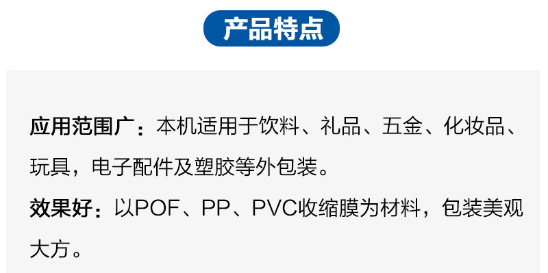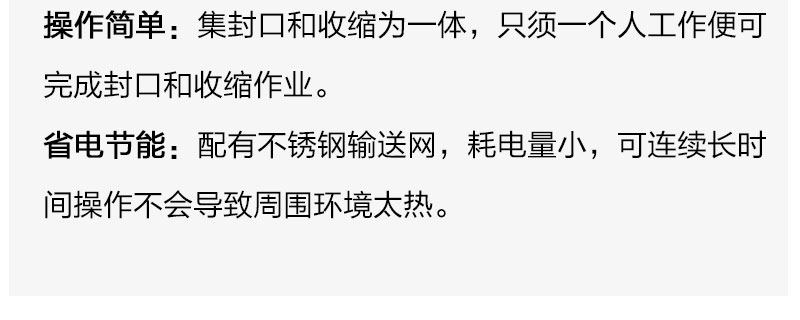 本机适用于饮料、礼品、五金、化妆品、玩具,电子配件及塑胶等外包装。以POF、PP、PVC收缩膜为材料,包装美观大方。集封口和收缩为一体,只须一个人工作便可完成封口和收缩作业。配有不锈钢输送网,耗电量小,可连续长时间操作不会导致周围环境太热。