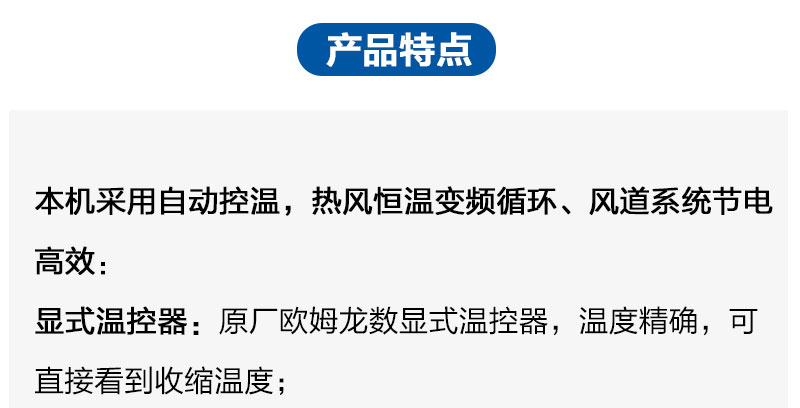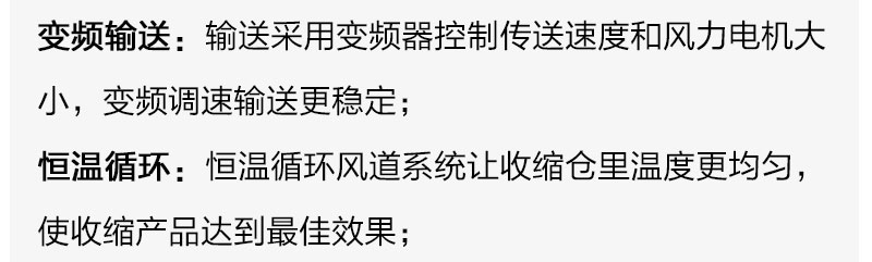 本机由变频输送、恒温加热机电一体组成本机采用自动控温,热风恒温变频循环、风道系统节电高效原厂欧姆龙数显式温控器,温度精确,可直接看到收缩温度输送采用变频器控制传送速度和风力电机大小,变频调速输送更稳定恒温循环风道系统让收缩仓里温度更均匀,使收缩产品达到空芯拉丝钢杆内置高温自传轴承外包进口硅胶管,链杆式输送经久耐用,可根据不同产品的采用不同材质的输送结构。