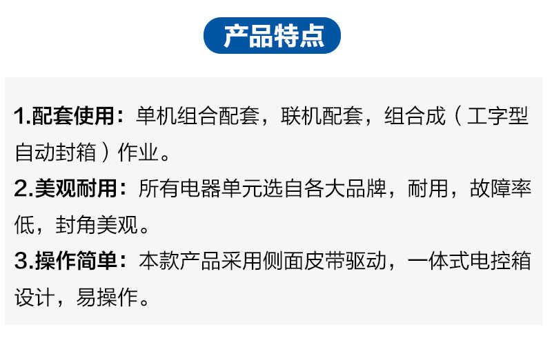 本套系列是以单机组合配套,H型四角边封箱系列,联机配套,组合成(工字型自动封箱)作业;轻巧耐用,操作简单,无噪音,标准规格品、零件随时供应。 本公司可根据客户要求进行非标设计生产。