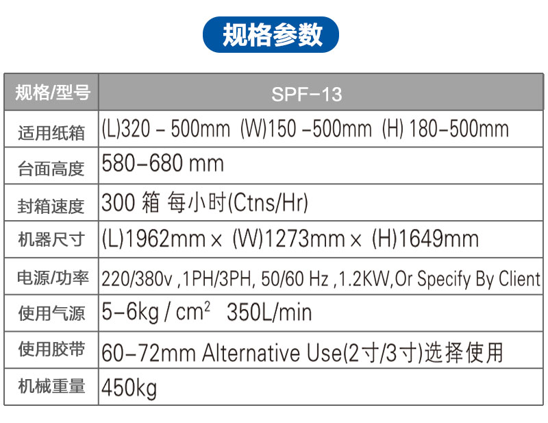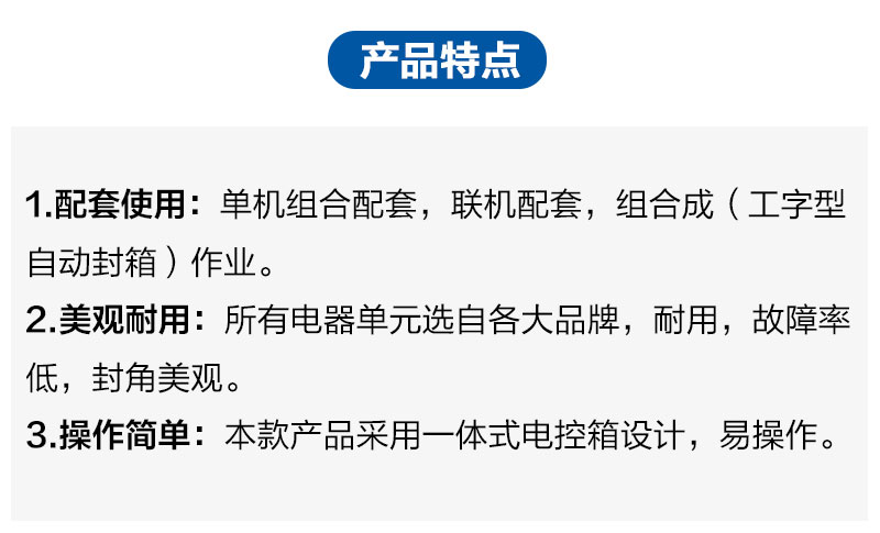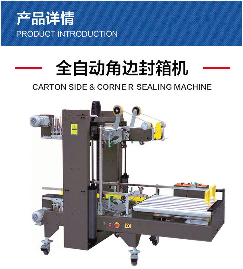 自动调节纸箱大小规格,适用多种规格纸箱同时封箱;自动同时四个角边封封箱;操作简单、使用方便、容易调整、封箱速度快、效率高、坚固耐用,适合配套自动化后道包装流水线全天候大量使用。采用特殊设计,胶带粘贴,抚平,整齐美观。用印字胶带,更可提高新产品形象。 广泛应用在家用电器、纺织、食品、百货、医药、化工等行业。可与全自动折盖封箱机配套使用,完成“工”字型封箱。