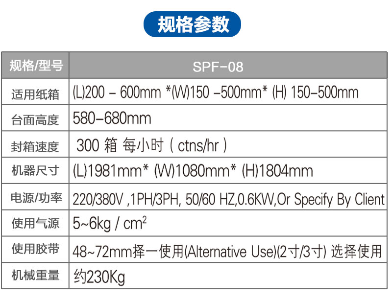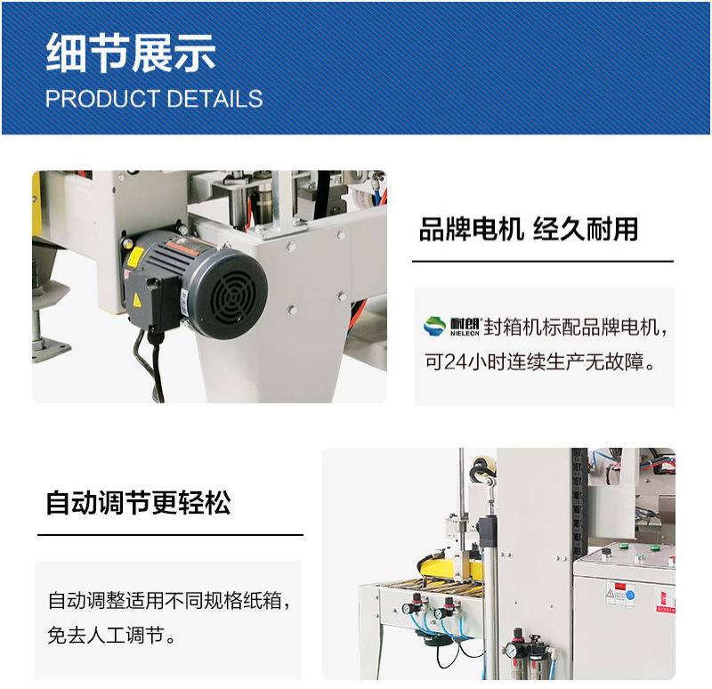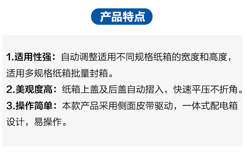 自动调整不同规格纸箱的宽度和高度侧边驱动式自动校正调整、送箱、运转平稳纸箱上盖及后盖自动折入,快速平压不折角采用台湾城邦电机,总功率为360瓦,可24小时连续生产无故障关键部位采用胎模具及激光切割而成标准机,零件随时供应。可根据用户要求非标定做。