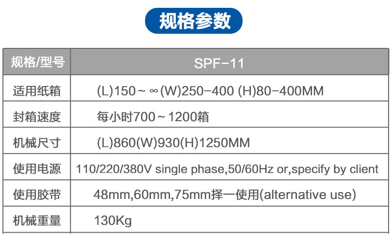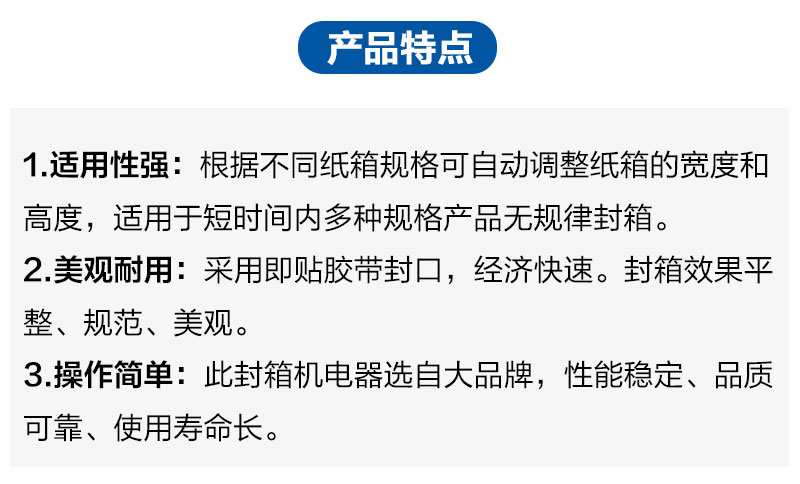 本机设计可配套流水线或单机使用,根据不同纸箱规格可自动调整纸箱的宽度和高度,适用于短时间内多种规格产品无规律封箱;上下皮带驱动,纸箱输送平稳,封箱效果完美;标准规格品,厂家零件随时供应。本公司可根据客户要求进行非标设计生产。