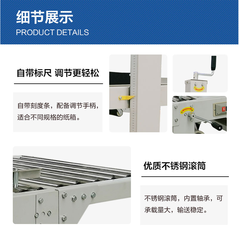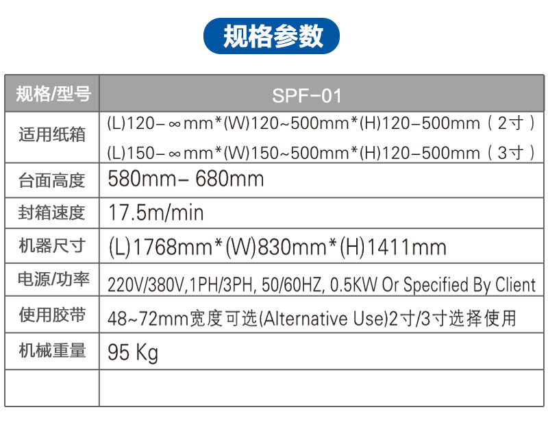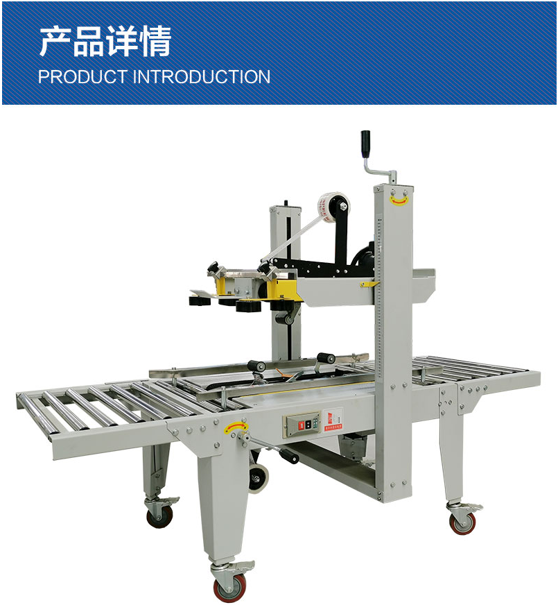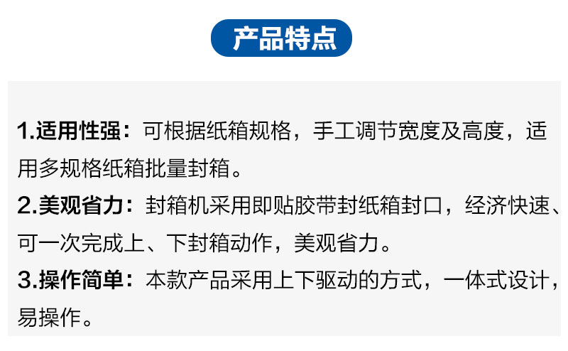 本机采用上下驱动的方式主要适用于纸箱的封箱包装,既可单机作业,也可与流水机配套使用,广泛应用于在家用电器、纺织、食品、百货、医药、化工等行业。封箱机采用即贴胶带封纸箱封口,经济快速、容易调整,可一次完成上、下封箱动作,采用印字装置,更可提高产品形象。