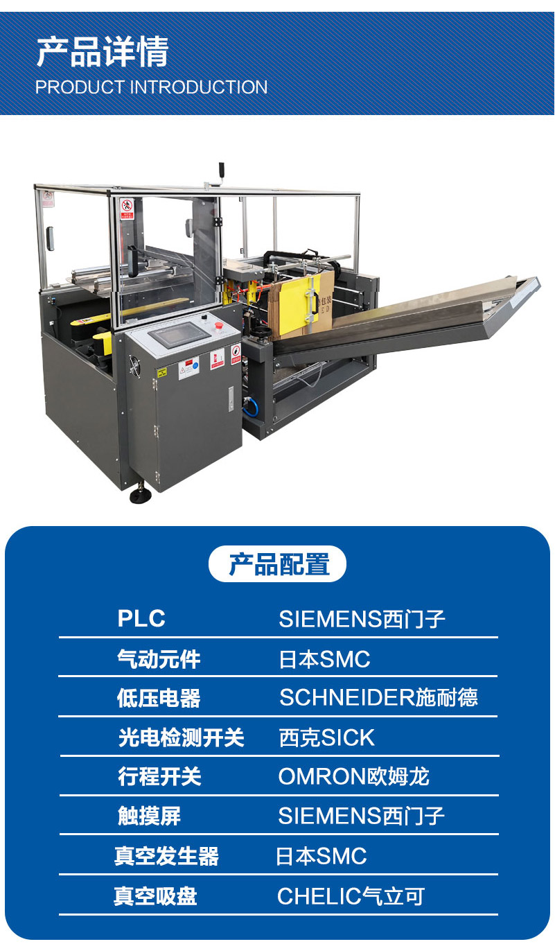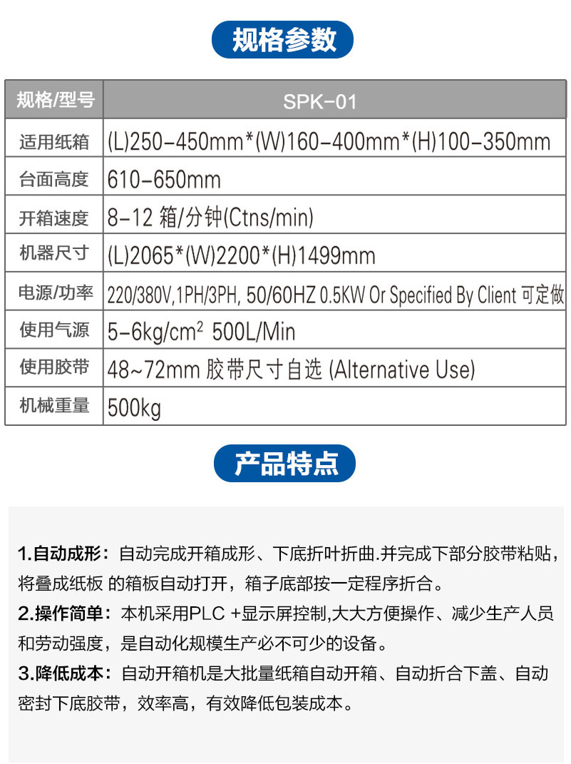 自动完成开箱、成形、下底折叶折曲.并现时完成下部分胶带粘贴,将叠成纸板 的箱板自动打开,箱子底部按一定程序折合,并用胶带密封后输送给装箱机的专用设备。自动开箱机是大批量纸箱自动开箱、自动折合下盖、自动密封下底胶带的流水线设备,本机采用P.L.C +显示屏控制,大大方便操作、管理、减少生产人员和劳动强度,是自动化规模生产必不可少的设备。操作方便,降低包装成本。