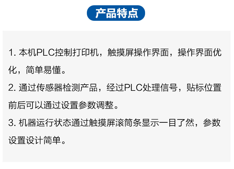 1. 本机PLC控制打印机,触摸屏操作界面,操作界面优 化,简单易懂。 2. 通过传感器检测产品,经过PLC处理信号,贴标位置 前后可以通过设置参数调整。 3. 机器运行状态通过触摸屏滚筒条显示一目了然,参数 设置设计简单。