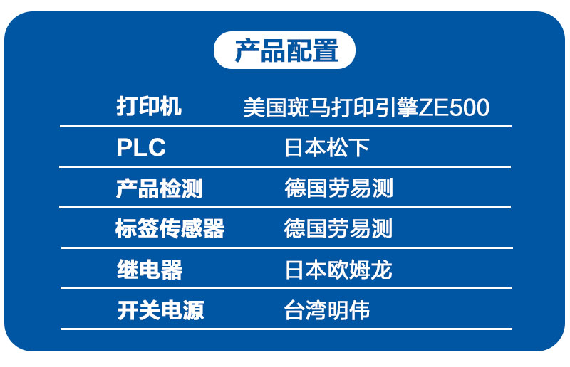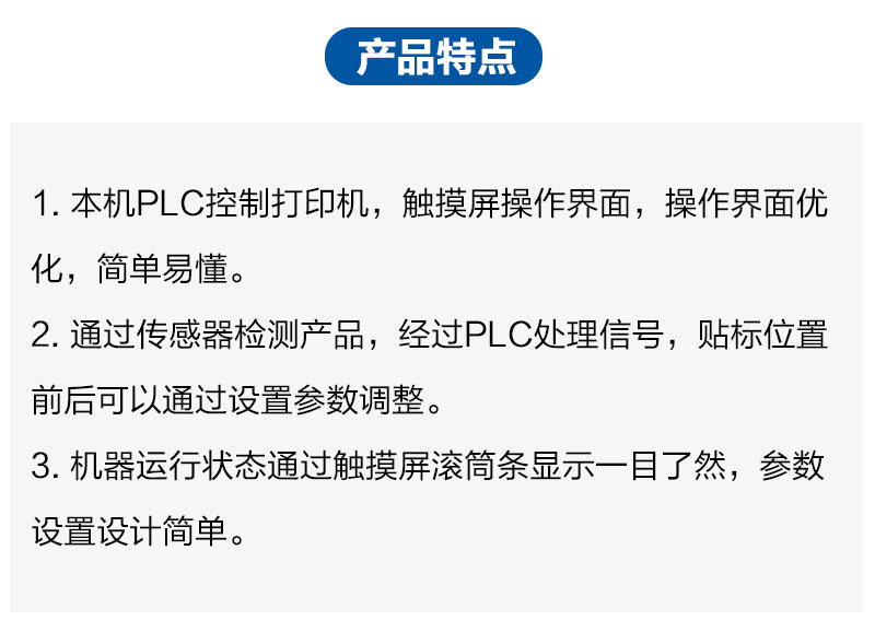1. 本机PLC控制打印机,触摸屏操作界面,操作界面优 化,简单易懂。 2. 通过传感器检测产品,经过PLC处理信号,贴标位置 前后可以通过设置参数调整。 3. 机器运行状态通过触摸屏滚筒条显示一目了然,参数 设置设计简单。