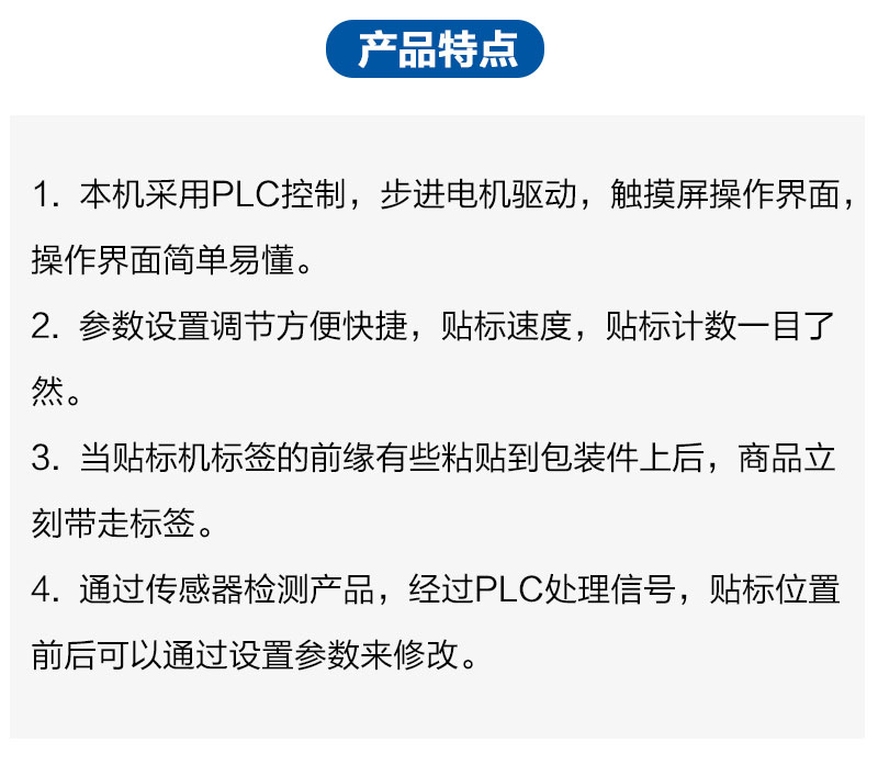 本机采用PLC控制,步进电机驱动,触摸屏操作界面,操作界面简单易懂。参数设置调节方便快捷,贴标速度,贴标计数一目了然。当贴标机标签的前缘有些粘贴到包装件上后,商品立刻带走标签。通过传感器检测产品,经过PLC处理信号,贴标位置前后可以通过设置参数来修改。